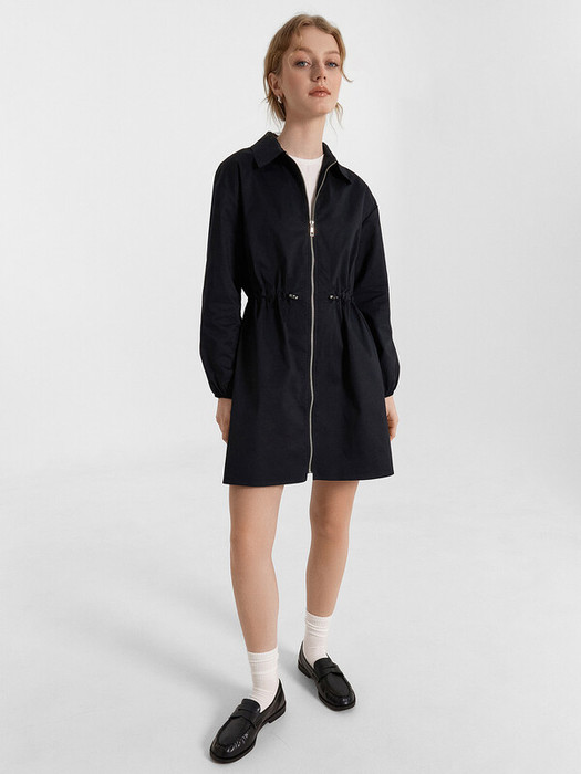 Платье прямое свободное, длиной мини. Горловина круглая со стояче-отложным воротником. Рукава втачные длинные, присбореные по низу на эластичную тесьму (внутр. 10мм 10RV). Линия плеча спущена. Платье по талии присборено на шляпную резину (т. эластичн. 2,8мм SFKR-1) с фиксаторами (SFFKR-1). По переду обработана центральная застежка на молнию. Борта обработаны подбортами. Нижний срез платья обработан швом вподгибку.