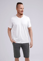 Шорты мужские прямого силуэта из трикотажного полотна футер. Пояс отрезной из основного полотна с эластичной тесьмой внутри. По поясу проложены отделочные строчки. По внутренней части пояса втавлен кругловязаный шнур. В боковых швах обработаны карманы с отрезным бочком, подкладка карманов кулирка.
