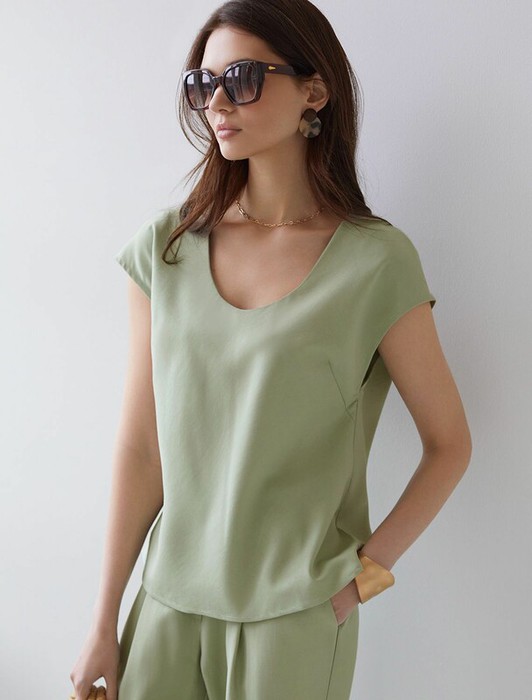 Элегантная блузка темно-синего цвета скроенная по косой выполнена из плотного лиоцелла. Лиоцелл это более дорогой и экологичный вариант вискозы, очень прочный и шелковистый. Эта повседневная блузка с трендовым U-вырезом создана для легкого и утонченного стиля. Мягкие линии кроя создают невероятно эффектный образ, который подчеркивает естественную красоту, не стесняя движений, а свободный фасон дарит ощущение абсолютного комфорта и уверенности. Блузка красиво драпируется при движении, создавая летящий, воздушный эффект. Эта легкая блуза с коротким рукавом идеальный выбор для комфорта и стиля в теплое время года, она будет идеальна для любого повода.