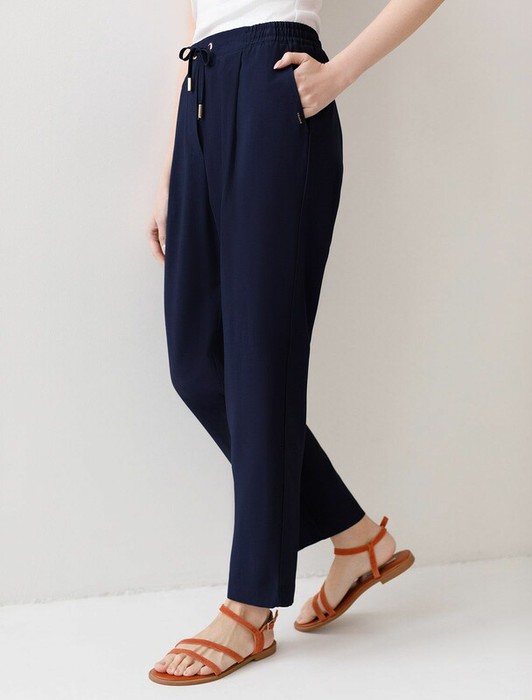 Брюки бананы темно-синего цвета выполнены из плотного лиоцелла. Лиоцелл это более дорогой и экологичный вариант вискозы, очень прочный и шелковистый. Модель отличается свободным кроем в бедрах и заужены к щиколотке. Удобный пояс на мягкой на резинке обеспечивает идеальную посадку по фигуре и гарантирует комфорт. Свободные брюки с высокой посадкой и аккуртными защипами создают идеальный силуэт и будут базовым элементом гардероба.  Летние брюки отлично сочетаются с монохромным верхом, с ними можно создавать эффектные наряды как на выход, так и для ежедневных рабочих дел или простых прогулок.