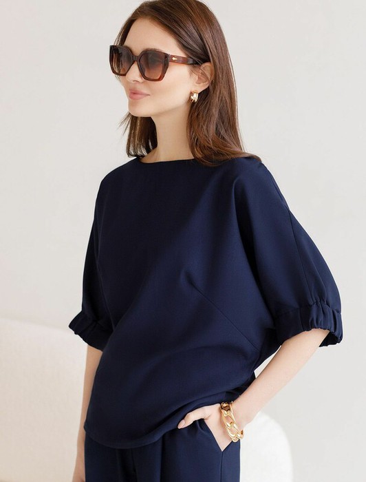Свободная блузка темно-синего цвета выполнена из плотного лиоцелла. Лиоцелл это более дорогой и экологичный вариант вискозы, очень прочный и шелковистый. Современная интерпретация кроя «летучая мышь» дополнена акцентными эластичными манжетами. Эта блузка идеальна для любого типа фигуры, в том числе и на королевские размеры. Этот крой создан для того, чтобы мягко скрыть лишние объемы. Эта повседневная блузка с вырезом лодочка создана для легкого и утонченного стиля. Мягкие линии кроя создают невероятно эффектный образ, который подчеркивает естественную красоту, не стесняя движений, а свободный фасон дарит ощущение абсолютного комфорта и уверенности. Блузка красиво драпируется при движении, создавая летящий, воздушный эффект.