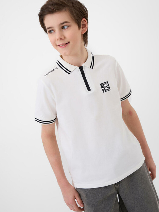 Поло прямого силуэта с коротким рукавом для мальчика подростка. Выполнено из фактурного трикотажа пике. Спереди — короткая застежка-молния до середины груди. На груди расположен вертикальный логотип, на плече и спине — надписи. У изделия разрезы по бокам и декоративные детали по горловине.