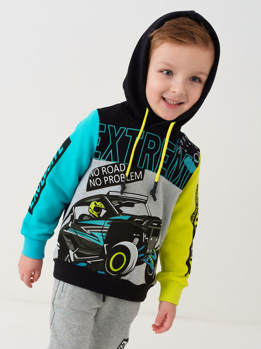 Детское худи для мальчика. Модель прямого кроя. Выполнено из хлопкового футера без начеса. На груди и рукавах — крупный красочный принт, вдохновлённый мотоспортом. Капюшон регулируется шнурком. Манжеты и низ изделия выполнены из эластичного риба, что обеспечивает комфортную посадку.
