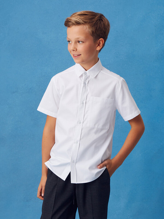 Сорочка для мальчика из смесового хлопка полуприлегающего силуэта с короткими рукавами. Воротник отложной со стойкой. Левая сторона полочки дополнена накладным карманом. Застёжка по центру переда на планку с кнопками.
