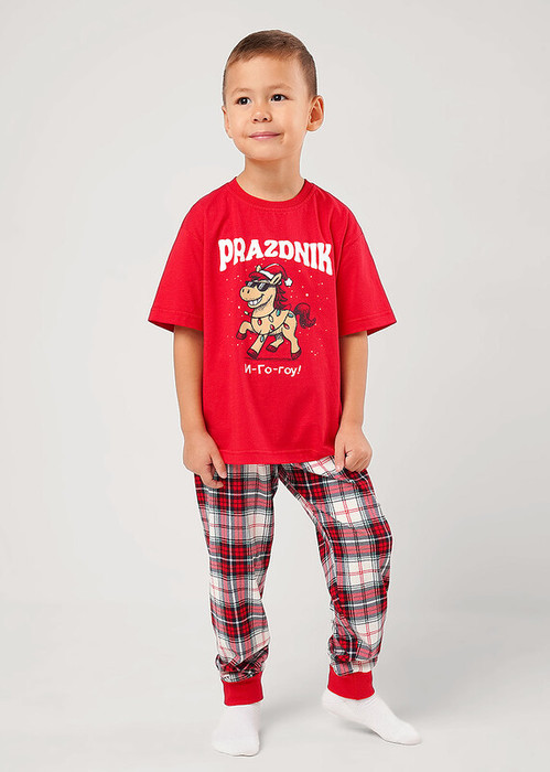 Новогодняя хлопковая пижама для мальчика, состоящая из футболки и брюк. Футболка свободного кроя дополнена оригинальным принтом спереди. Брюки умеренного объёма с эластичным удобным поясом, выполнены из хлопкового полотна в стильную клетку.