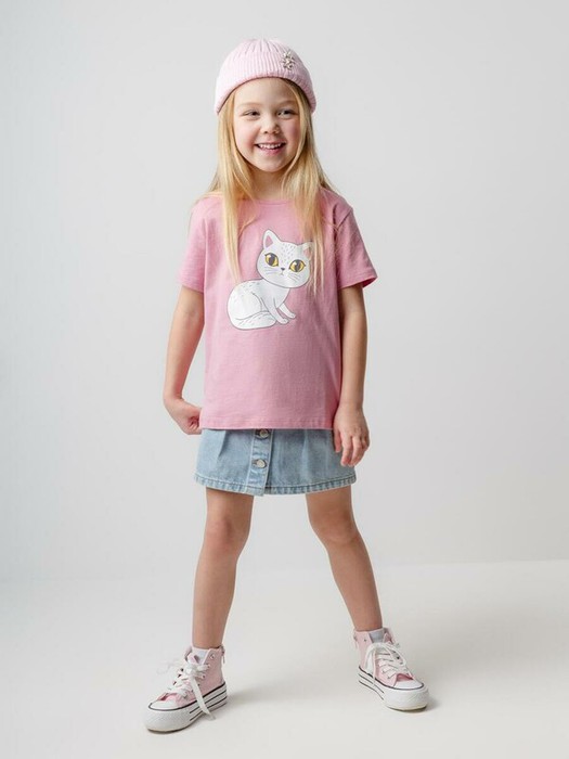 Футболка для девочки из гладкого трикотажа, произведённого из высококачественного натурального хлопка. Оригинальный принт выполнен из стойких текстильных гипоаллергенных красителей. Для удобства в размерах 92 и 98 имеется застежка на кнопки на спинке. Оригинальный принт выполнен из стойких текстильных гипоаллергенных красителей. Изделие сохраняет цвет и форму после многократных стирок.