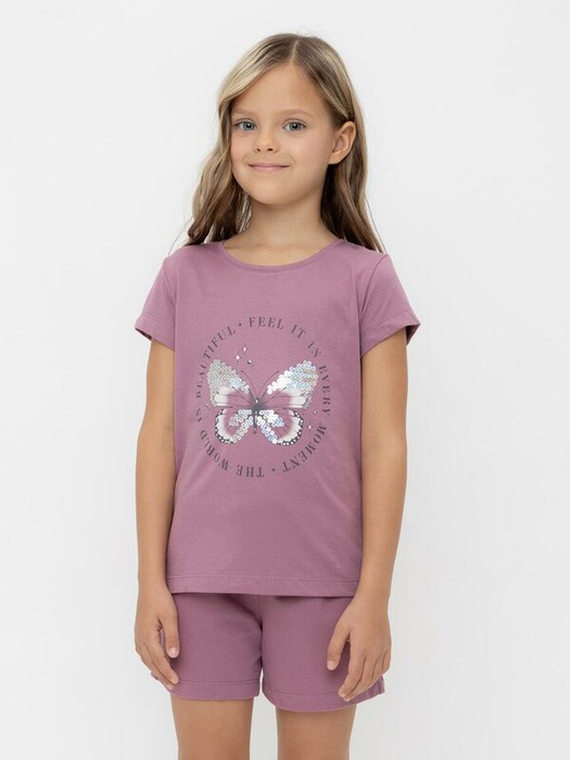 Футболка для девочки из гладкого трикотажа, произведённого из высококачественного натурального хлопка. Для удобства одевания имеется застежка на кнопки в размерах 92 и 98. Оригинальный принт выполнен из стойких текстильных гипоаллергенных красителей и украшен пайетками. Изделие сохраняет цвет и форму после многократных стирок.