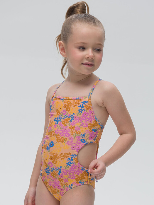 Купальник слитный для девочки. Мягкая эластичная ткань разработана специально для купальных костюмов и идеально садится по фигуре. Быстро сохнет и практически нет выгорания на солнце. По бокам купальника круглые отверстия, которые можно затянуть шнуром из основной ткани, что позволяет регулировать купальник по росту девочки. Лямки с регулировкой по длине. Подходит для пляжа, моря, бассейна.