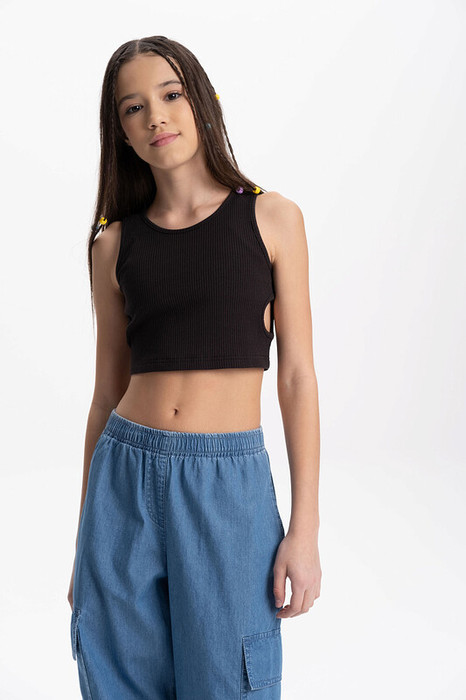 Кроп-топ из модной ткани в рубчик для девочки. Преобладающие в составе ткани хлопок и вискоза делают эту модель мягкой, дышащей и очень комфортной для ребёнка. Благодаря эластану изделие сохраняет форму. По бокам небольшие круглые вырезы — один из актуальных летних трендов. Топ лаконичного дизайна прекрасно сочетается с различными шортами и юбками. Отличный выбор для летнего отдыха!