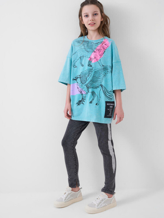 Футболка оверсайз для девочки подростка. Модель удлиненная, выполнена из меланжевого хлопкового трикотажа джерси. Красочный принт. Горловина круглая. В нижней части — небольшая нашивка.