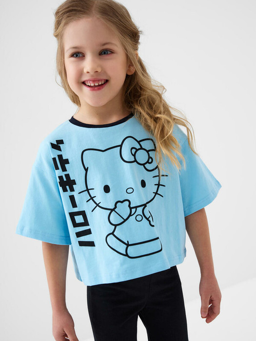 Детская футболка для девочки. Модель свободного кроя, выполнена из эластичного хлопкового трикотажа джерси. На груди расположен крупный принт с любимым персонажем Хэллоу Китти.