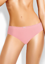 Трусы слипы женские из эластичного хлопкового полотна. Обработка краев по талии окантовочная резинка, спереди по ноге - полуокантовка, сзади по ноге - узкое кружево. По переду атласный бант.