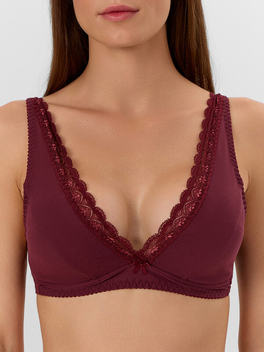 Повседневный хлопковый бюстгальтер. Благодаря тонким дубляжным чашкам и отсутствию каркасов практически не ощущается на теле. Узкое эластичное кружево на срезе декольте делает модель очень женственной.