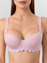 Бюстгальтер женский с мягкой чашкой, на каркасах, из эластичной сетки с флоком. Чашка с вытачкой, с выступом. Верхний срез чашки обработан швом вподгибку с эластичной тесьмой внутри. Ластовица выполнена из бретельной тесьмы 15 мм (SWE3-15). Пройма, верхний и нижний срезы стана обработаны в два приема эластичной тесьмой.