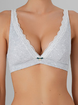 Бюстгальтер с мягкими треугольными чашками, без каркасов, выполнен из трикотажного полотна рибана. Чашка с вытачкой, на подкладке из трикотажного кулирного полотна. Верхний срез, срез проймы и верхний срез бочка окантованы бейкой из основного полотна с эластичной тесьмой внутри  с отделочной строчкой с верхним застилом.