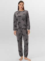 Очаровательный пижамный комплект. Состоит из лонгслива и брюк. Выполнен из хлопкового полотна. Лонгслив длиной до середины ягодиц, прямого силуэта, с круглой горловиной, слегка укороченными рукавами, спущенной линией плеча и фигурным низом. Брюки длинные, свободные. Ваш сон будет комфортным!