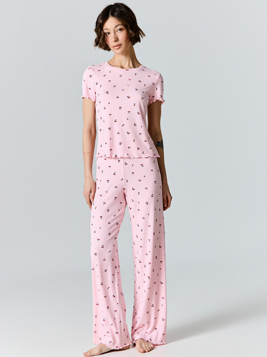 Домашний комплект с принтом выполнен из мягкой рибаны, которая обладает приятной эластичностью и нежно облегает тело, не стесняя движений.