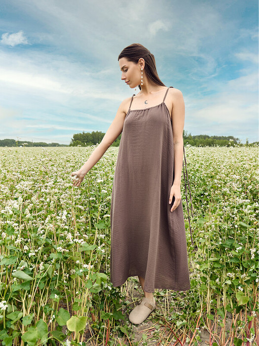 Сарафан женский свободного силуэта из ткани, муслин. Горловина с кулиской, присборена. В кулису протянута бейка, образующая бретели. Бретели завязываются на бантик. Низ сарафана застрочен швом в подгибку.