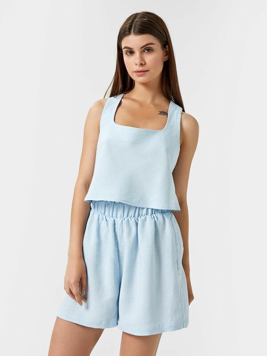 Стильный топ на широких бретелях. Выполнен из премиального льна и нежной легкой вискозы. Силуэт прямой, длина до линии талии. Вырез декольте достаточно глубокий, формы "каре". На спинке есть петелька-вешалка. Рекомендуем для стильных летних образов!