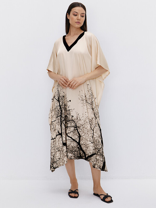 Удобное, элегантное и женственное платье-туника идеально подойдет для дома и сна. Художественный принт в виде контрастных ветвей сакуры выглядит как произведение искусства и дополняет грацией и изяществом повседневный домашний образ.