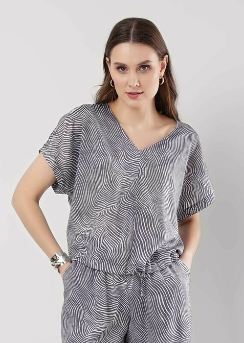 Блузка свободного кроя из текстильного полотна штапель.Спереди отстроченный средний шов. V-образный вырез горловины с внутренней окантовкой. Цельнокроеный короткий рукав, по низу с манжетом. По низу изделия кулиса из окантовки.