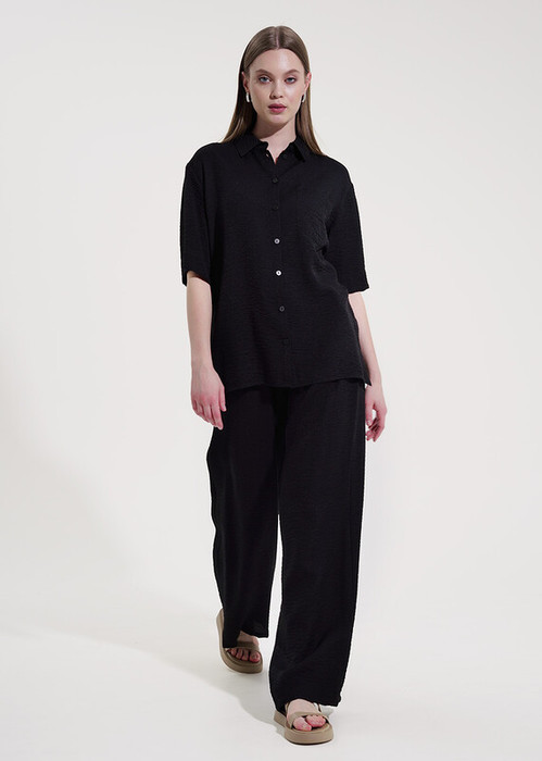 Комплект из текстильного полотна штапель-креп. Блузка свободного кроя. Втачной рукав. Отложной воротник спереди планка на пуговицах,накладной карман.Боковые разрезы.Брюки широкие. По талии пояс на резинке,с завязками. Боковые карманы в отрезном бочке.