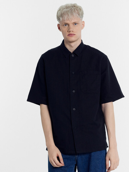 Рубашка прямого силуэта, свободная. Рукава втачные короткие. Воротник отложной с цельнокроеной стойкой. Центральная застежка на петли и пуговицы. Борта с цельнокроеными подбортами. На левой детали переда настрочен накладной карман. Спинка с отрезной кокеткой. По низу боковых швов обработаны разрезы. Нижний срез сорочки и рукавов обработан швом вподгибку с закрытым срезом.