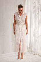 Модель А-силуэта с завышенной талией. Ткань с характерным мягким блеском хорошо драпируется и струится по телу. В жаркое время года приятно охлаждает кожу.