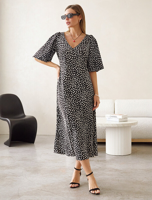 Платье А-силуэта кроеное по косой из струящегося полиэстера. Женственная модель с V-вырезом. Рукава выполнены на подкладке, которая позволяет им держать, заданную форму буфа даже во время движения. Высокотехнологичный, современный ПЭ легкий и гладкий - приятен к телу, как натуральный шелк, немного холодит и совершенно не мнется. Подойдет для торжественного выхода или повседневного образа.