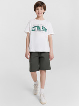 Шорты карго прямого силуэта из текстильного полотна. Посадка средняя. Длина выше колена. Пояс цельнокроеный  с эластичной тесьмой и шнуром внутри. По поясу выполнены три декоративные строчки. На передних деталях брюк настрочен один карман с клапаном, обработаны карманы с наклонным входом от боковых швов. Низ изделия обработан швом в подгибку.
