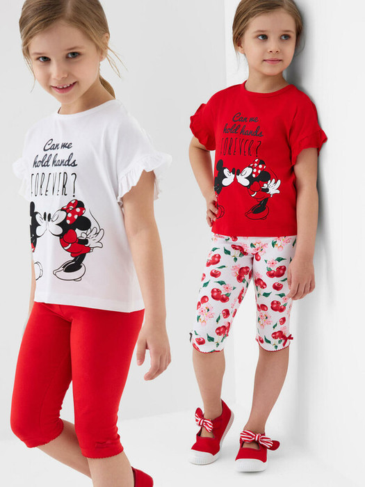 Набор детских легинсов для девочки. Комплект состоит из двух пар укороченных легинсов. Первая пара выполнена в классическом красном цвете, вторая — с ярким принтом вишен, листьев и цветов. Леггинсы украшены декоративными бантиками. Обе модели имеют высокую посадку и эластичный пояс, который хорошо фиксирует изделие на талии. Материал - мягкий, хлопковый трикотаж.