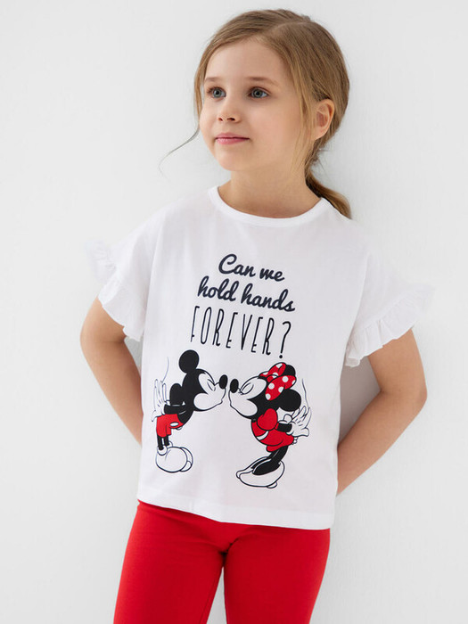 Детская футболка для девочки. Модель свободного кроя, выполнена из эластичного хлопкового трикотажа джерси. Красочный принт с любимыми мультяшными героями Минни и Микки Маус. Горловина круглая. Рукава с оборками.