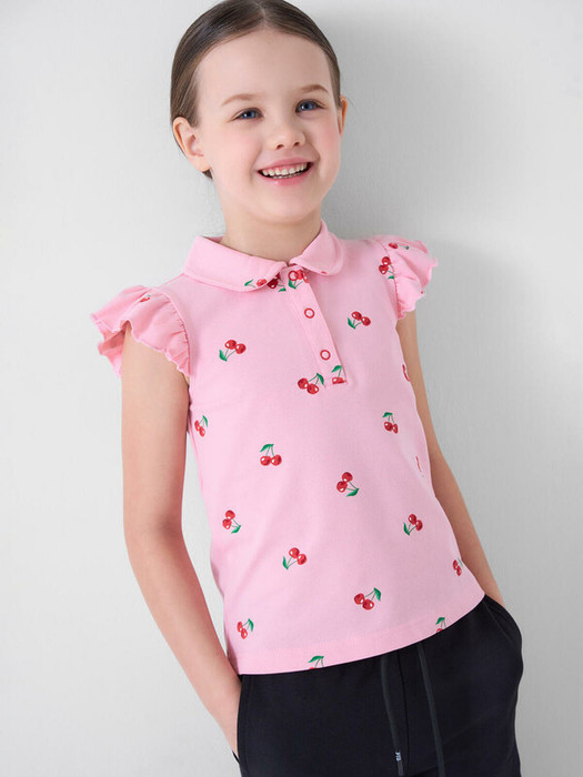 Детская футболка-поло для девочки. Модель прямого кроя, выполнена из эластичного хлопкового трикотажа пике. Яркий принт с вишнями. Отложной воротник с застежкой на кнопки. Рукава-крылышки.