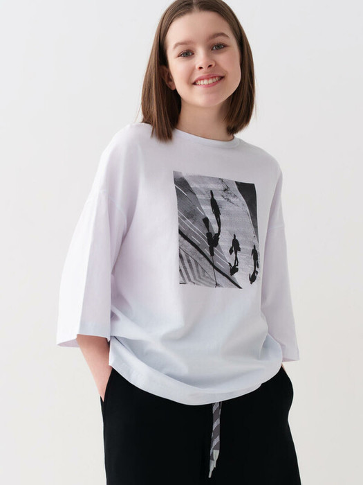 Футболка оверсайз для девочки подростка. Выполнена из хлопкового трикотажа джерси. На передней части - крупный фотопринт. Ворот оформлен круглой эластичной вставкой из риба. На спинке — декоративный вертикальный шов и небольшая резиновая нашивка.