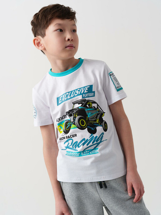 Футболка оверсайз для мальчика подростка. Модель выполнена из эластичного хлопкового трикотажа джерси. Крупные принты и нашивка в гоночной тематике.