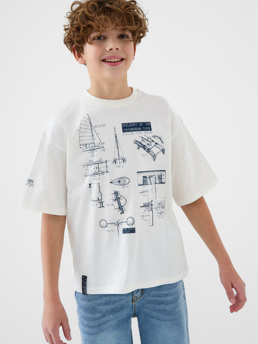 Футболка оверсайз для мальчика подростка. Модель выполнена из эластичного хлопкового трикотажа джерси. Спереди расположен крупный принт, вдохновленный Санкт-Петербургом. Горловина круглая, обработана эластичным рибом. По низу - небольшая нашивка.