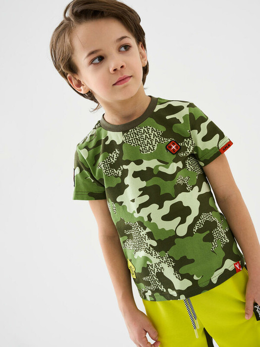 Детская футболка для мальчика. Модель прямого кроя, выполнена из эластичного хлопкового трикотажа джерси. Спереди расположен крупный принт. Горловина круглая, обработана эластичным рибом. Дизайн в стиле милитари с нашивками и принтами.