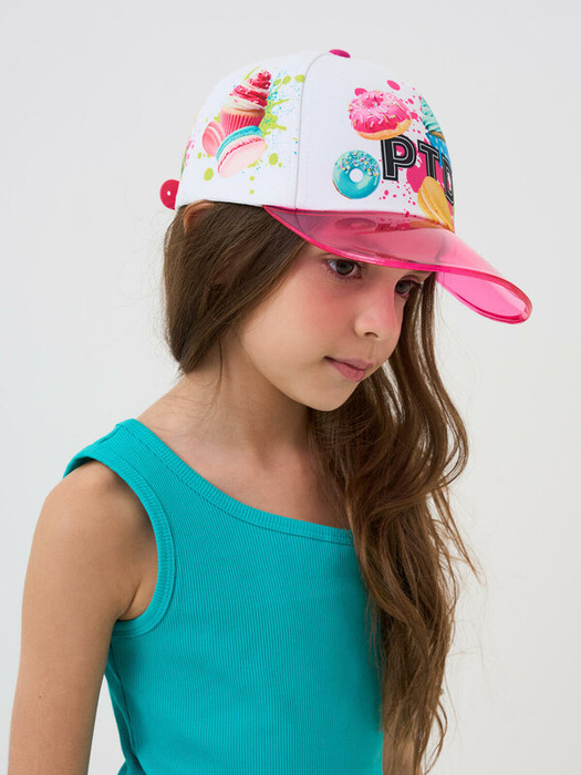 Бейсболка для девочки подростка. Модель имеет классическую форму с изогнутым прозрачным козырьком. Верх украшен ярким принтом с десертами — капкейками, макарунами и пончиками.