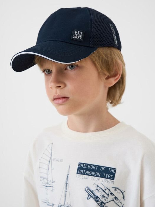 Бейсболка для мальчика подростка. Модель с изогнутым козырьком, выполненная из комбинации плотной хлопковой ткани и сетки. Передняя часть — темно-синяя, задняя — из черной сетки для лучшей вентиляции. На лицевой стороне — небольшая нашивка, а сбоку — декоративная лента с надписью. Сзади есть пластиковая застежка на кнопках, позволяющая регулировать размер.