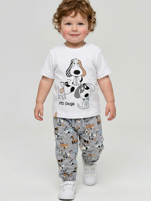 Детский костюм для мальчика. Состоит из футболки с коротким рукавом и брюк на резинке. Футболка прямого кроя с милыми принтами. Кнопки на плече для удобного переодевания. Брюки выполнены из хлопкового трикотажа, с комфортной посадкой, пояс на резинке дополнен шнурком. Удобные боковые карманы. Внизу — эластичные манжеты.