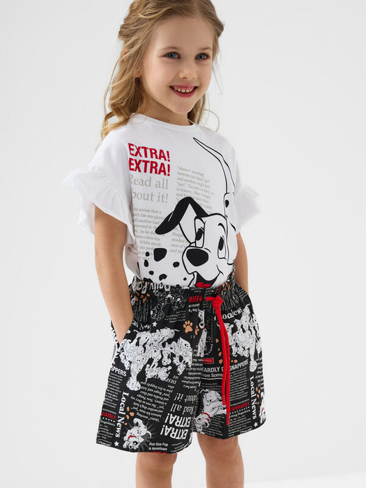Детский костюм для девочки. Состоит из футболки с коротким рукавом и шорт. Выполнен из хлопкового трикотажа. Футболка свободного кроя, с красочным принтом с любимыми мультяшными персонажами "101 далматинец". Декоративные сборки по рукавам. Шорты свободные, хорошо сидят на талии благодаря эластичному поясу и регулирующему шнурку. Удобные боковые карманы.
