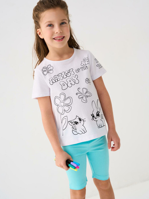 Детская футболка для девочки и набор фломастеров для рисования по ткани. Футболка прямого кроя, выполнена из мягкого хлопкового трикотажа белого цвета с принтом милых животных. В комплекте также идут фломастеры, которые позволят раскрасить футболку, создавая уникальный и персонализированный дизайн.