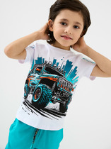Комплект: футболка, шорты. Размер изделия на фото - 110, параметры модели (см): рост 111, обхват груди-талии-бедер: 55-56-56. Из качественного эластичного и приятного на ощупь трикотажа джерси. Высокое содержание хлопка 95%. Благодаря наличию эластана в составе ткани изделие держит форму и меньше мнется. Эластичный пояс с тесьмой позволяет легко надевать и утягивать до идеальной посадки в зависимости от комплекции ребенка. Принт сохраняет первоначальный вид даже после многочисленных стирок