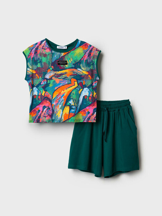 Костюм для девочки подростка. Состоит из футболки и шорт. Выполнен из хлопкового трикотажа. Футболка оверсайз, с коротким рукавом. На принте изображён фрагмент абстрактной живописной композиции Василия Кандинского — из работы «Импровизация 7». Шорты свободные, с эластичным поясом и шнурком для регулировки посадки. По бокам расположены карманы. Можно составить family look cо взрослым вариантом аналогичного дизайна.