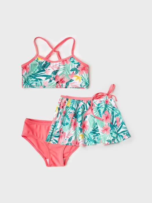 Комплект детский для девочки, состоящий из раздельного купальника и лёгкой юбочки. Топ с тонкими перекрещивающимися на спине бретелями, которые можно регулировать. Плавки однотонные, светло-розового цвета, классической формы с подкладкой. Юбка лёгкая, с тропическим рисунком, завязывается сбоку бантиком. Все края обработаны эластичной тесьмой, чтобы изделие хорошо сидело на теле и не натирало. Благодаря UF-защите, ткань сохраняет первоначальный вид даже при длительном пребывании на солнце. Подходит для плавания и активного отдыха.