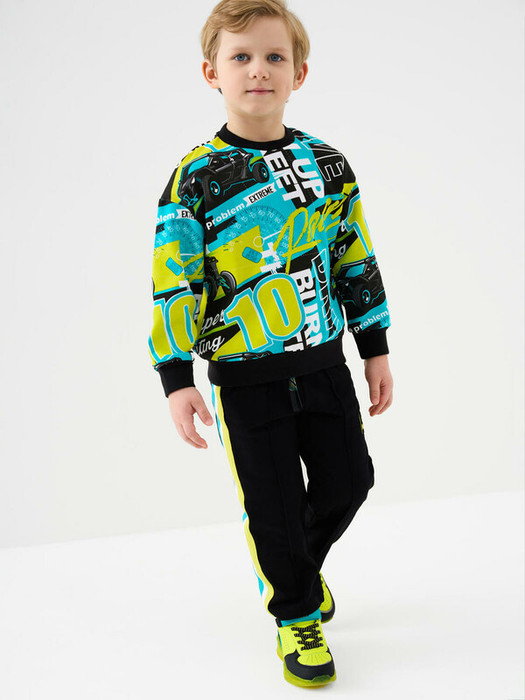 Детский спортивный костюм для мальчика. Комплект выполнен из хлопкового футера и состоит из свитшота и брюк на резинке. Толстовка прямого кроя с красочным принтом. Манжеты и пояс выполнены из эластичного риба, благодаря чему изделие хорошо держит форму. Широкие брюки — комфортные, с эластичным поясом и шнуром для регулировки посадки. Удобные боковые карманы.