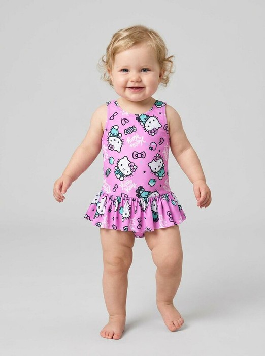 Слитный купальник для девочки с принтом Hello Kitty. Модель украшена короткой юбочкой по низу и декоративной эластичной вставкой на спинке. Вырез спереди классический, на спинке – углублённый. Проймы и горловина аккуратно обработаны эластичной окантовкой. Внутри предусмотрена подкладка. Благодаря UF-защите, ткань сохраняет первоначальный вид даже при длительном пребывании на солнце. Подходит для плавания и активного отдыха.