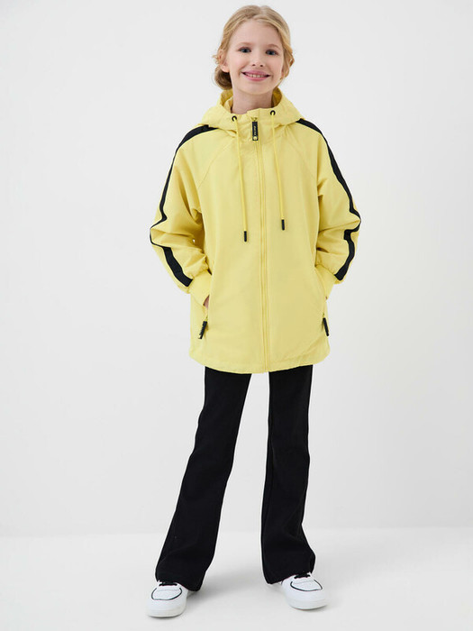 Ветровка для девочки подростка. Температурный режим от +20С до +10С. Ткань с ветрозащитным и водоотталкивающим покрытием. Внутри мягкая подкладка из трикотажа.  Капюшон несъемный с утяжкой шнуром спереди, сзади утяжка на стопперы. Два боковых кармана на молнии. Внутренний карман-сетка. Манжеты на резинке. Низ изделия на утяжке стопперами. Светоотражающие элементы на спинке и капюшоне обеспечивают дополнительную безопасность в темное время суток.