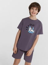 Пижама для мальчика подростка. Футболка оверсайз с короткими рукавами и круглым воротом оформлена крупным принтом на спинке с изображением скейтбордиста, а спереди — креативным принтом. Шорты имеют камуфляжный узор в чёрно-серой гамме и дополнены ярко-оранжевым декоративным шнурком в поясе. На шортах предусмотрены боковые карманы. Изделие выполнено из мягкого хлопкового трикотажа.