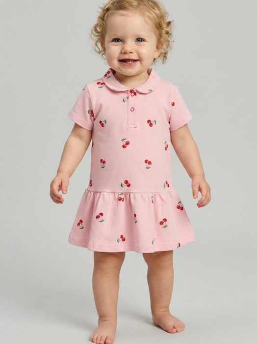 Летнее детское платье-поло для девочки. Выполнено из мягкого хлопкового трикотажа пике с милым принтом вишен. Короткие рукава с отворотами, классический воротник поло и застежка на кнопки спереди. По низу — присборенная юбка, создающая нежный силуэт.